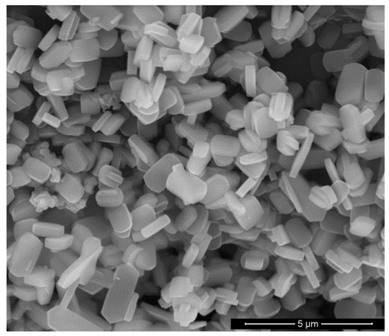 Scanning electron microscopy (SEM) characterization provided morphology information of the hierarchical ZSM-5 zeolite. Figure 3 clearly shows that the as-synthesized ZSM-5 zeolite had hexagonal structure and a coffin-like shape [25]. ZSM-5 zeolite synthesized using TPAOH template to form MFI framework has coffin-like morphology and has hexagonal crystal geometry [7]. However, the mesoporosity of the surface is not clearly visible, as reported by Wang et al. [7]. Therefore, it is necessary to perform surface area analysis to identify the ZSM-5 as a porous material.
