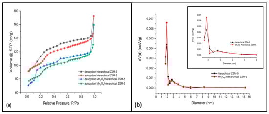 Comparison of; (a) isotherm adsorption-desorption graphs and (b) pore size distribution of ZSM-5 and Mn3O4/ZSM-5.