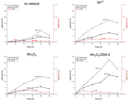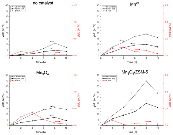 The conversion of delignified cellulose to levulinic acid was conducted on three different types of Mn catalysts, i.e., Mn3O4/hierarchical ZSM-5 and solid Mn3O4 (heterogeneous catalysts), and Mn2+ solution (homogeneous catalyst). The Mn3O4 represent the Fenton-like species because it consists of Mn2+ and Mn3+ in the same structure [31,32], which in the presence of H2O2 could undergo reaction as in Equations (1) and (2). Furthermore, the role of hierarchical ZSM-5 as support catalyst was also studied by observing the reaction profile when Mn3O4/ZSM-5 is used as a catalyst. The reaction using hierarchical ZSM-5 as catalyst has been discussed in significant detail in our other work [17]. Finally, reaction with a homogeneous solution of Mn2+ catalyst was used as comparison, and the reaction without catalyst as control. All the reactions were carried out in phosphoric acid (H3PO4) 40% (v/v) media with reflux, since cellulose is soluble in phosphoric acid (which is able to damage the intra- and inter-molecular hydrogen bonds in cellulose) but difficult to dissolve in water [33]. The Fenton-like species was used for the next step, with phosphoric acid as media and the Fenton-like reaction of manganese also giving H+ to the increased acidic media. The cellulose can be degraded using a Fenton-like reagent such as H2O2 together with a catalyst, and by a phosphoric acid solution [33].