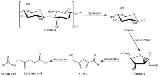 Cellulose conversion, in acidic condition, to levulinic acid follows a complex reaction pathways [35], which involves the production of glucose, fructose, and 5-HMF as intermediates and formic acid as the by-product. In this work, only formation the of 5-HMF and formic acid were studied.