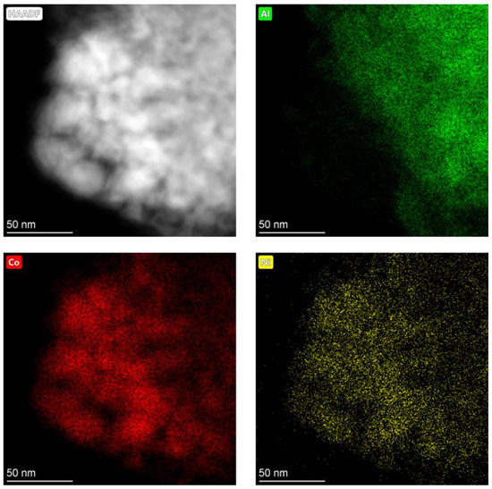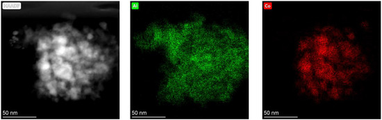 HAADF-STEM image of sample 25%Co. Elemental mapping legend: (green) aluminum and (red) cobalt.