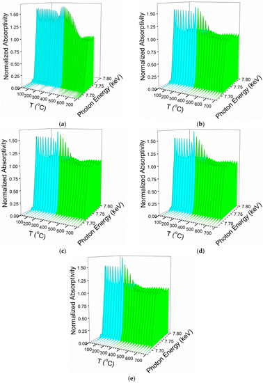 H2-TPR-XANES spectra (XY view) at the Co K-edge of (a) 25%Co/Al2O3, (b) 25%M (M = 5%Ni-95%Co)/Al2O3, (c) 25%M (M = 10%Ni-90%Co)/Al2O3, (d) 25%M (M = 25%Ni-75%Co)/Al2O3, and (e) 25%M (M = 50%Ni-50%Co)/Al2O3.