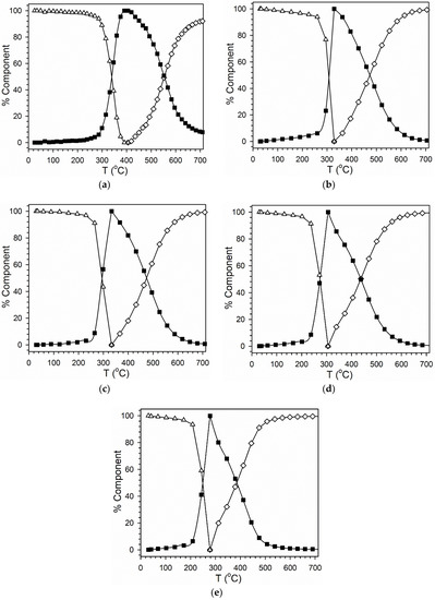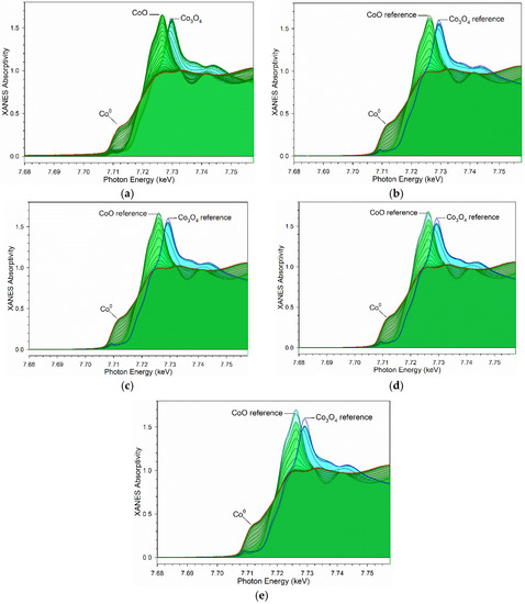 Linear combination XANES fittings at the Co K-edge are provided in Figure 7. For all of the catalysts, the initial spectrum at 25 °C resembles that of Co3O4. The point of 50%Co3O4/50%CoO was reached at 339 °C (Ni/Co = 0/100), 308 °C (Ni/Co = 5/95), 294 °C (Ni/Co = 10/90), 273 °C (Ni/Co = 25/75), and 249 °C (Ni/Co = 50/50). Thus, up to a Δ 90 °C decrease in reduction temperature was achieved. The point of 100%CoO was obtained at 400 °C (Ni/Co = 0/100), 330 °C (Ni/Co = 5/95), 330 °C (Ni/Co = 10/90), 305 °C (Ni/Co = 25/75), and 278 °C (Ni/Co = 50/50). Thus, up to a Δ 122 °C decrease in reduction temperature was obtained in converting Co3O4 to CoO by increasing the Ni/Co ratio.