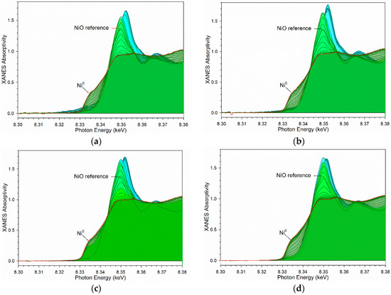 H2-TPR-XANES spectra at the Ni K-edges of (a) 25%M (M = 5%Ni-95%Co)/Al2O3, (b) 25%M (M = 10%Ni-90%Co)/Al2O3, (c) 25%M (M = 25%Ni-75%Co)/Al2O3, and (d) 25%M (M = 50%Ni-50%Co)/Al2O3. (Cyan) is Ni2+ (e.g., NiO) associated with cobalt oxides during reduction of Co3O4 to CoO. (Green) is reduction of Ni2+ to Ni0 when NiO reduction is associated with CoO reduction to Co0.