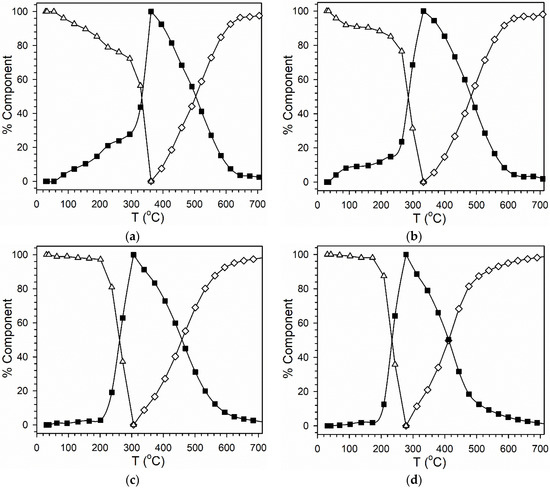 LC fittings of H2-TPR-XANES spectra at the Ni K-edge of (a) 25%M (M = 5%Ni-95%Co)/Al2O3, (b) 25%M (M = 10%Ni-90%Co)/Al2O3, (c) 25%M (M = 25%Ni-75%Co)/Al2O3, and (d) 25%M (M = 50%Ni-50%Co)/Al2O3. Legend: △ Ni2+ associated with Co3O4, ■ Ni2+ associated with CoO, and ◇ Ni0 associated with Co0.