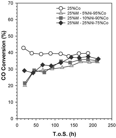 CO conversion in the first 200 h is shown in Figure 20. The CO conversion for the unpromoted catalyst has an initial value of 42.5%, and then it slightly decreases in the first few hours until a steady-state value of 39.5% was reached. This trend is typical for cobalt-based catalysts. In contrast, CO conversion progressively increases for all nickel-promoted catalysts. 5%Ni-95%Co and 10%Ni-90% exhibit similar CO conversion trends, as the former’s initial value is close to 20%, and it continuously increases, reaching 34%, whereas 25%Ni-75%Co has a higher initial CO conversion (29%), and it reaches a steady-state value of 36%.