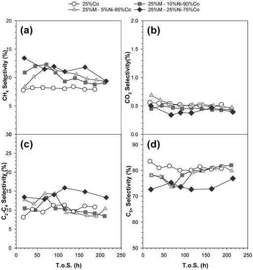 The evolutions of selectivities (CH4, CO2, C2-C4, and C5+) with T.o.S. (time on-stream) are shown in Figure 21. CH4 selectivity and C5+ selectivities are stable at 7.6% and 80.7%, respectively, for the unpromoted catalyst. The addition of nickel increases initial CH4 selectivity, whereas it decreases initial C5+ selectivity. Fortunately, CH4 selectivity for the nickel-promoted catalyst slowly decreased with T.o.S. For example, the initial CH4 selectivity for 25%M—25%Ni-75%Co is 13.4%, but it reaches 9.5% after 200 h. Thus, the difference compared to Co/Al2O3 decreases from 5.8% (absolute) to just 1.9%.