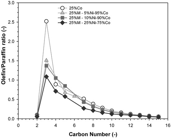 The olefin/paraffin ratio for unpromoted and nickel-promoted catalysts decreases with increasing carbon number, starting with ethylene species and moving upward (Figure 22). This trend is typically observed for cobalt based catalysts. However, even if the trend with the carbon number is similar among the different catalysts, the olefin content decreases by increasing the nickel content. Indeed, the olefin/paraffin ratio for C3 species is 2.5 for 25%Co, while it is only 1 for the 25%M—75%Co-25%Ni catalyst. At higher carbon numbers, the differences among the different Ni/Co catalysts are not so pronounced because of the tendency of olefins to readsorb on active sites [24]. The high hydrogenation capability of nickel promoted samples is also observed by a slight decrease in chain growth probability. Indeed αc5-c16 slightly decreases from 0.85 for 25%Co to 0.83 for 25%M—25%Ni-75%Co.