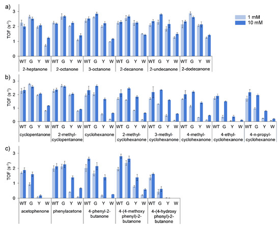 Effect of mutation of Thr513 (WT) to Gly (G), Tyr (Y) and Trp (W) on initial activity (TOF, kobs) of BVMOAFL210 towards linear (a), cyclic (b) and aromatic (c) ketones. Reaction conditions: 1 mL aqueous reaction mixtures containing 0.395 µM BVMO, 0.3 mM NADPH, buffer: 100 mM Tris-HCl (pH 9), 100 mM NaCl, substrate: 1 mM (light blue) or 10 mM (dark blue), 1% (v/v) methanol, 25 °C.