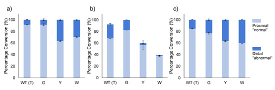 The absolute regioselectivity of wild-type BVMOAFL210 towards linear and aromatic ketones were retained by the mutants. The regioselectivity of the variants towards racemic mixtures of 2-methylcyclopentanone, 2-methylcyclohexanone and cis-bicyclo[3.2.0]hept-2-en-6-one was, however, altered (Figure 4a–c). In general, the T513G mutant of BVMOAFL210 did not change the regioselectivity considerably, whereas the mutants with the bulkier side chains were more significant, and also comparable, in effect. In CHMO, a W492A mutant was shown as more selective for all substrates evaluated [9], however, the change in regioselectivity of the BVMOAFL210 mutants could not be extended from one substrate to the other, with divergent profiles observed for each substrate. T513Y and T51W showed increased abnormal (distal) lactone formation with 2-methylcyclopentanone and cis-bicyclo[3.2.0]hept-2-en-6-one but higher regioselectivity towards 2-methylcyclohexanone in the production of the normal (proximal) lactone. To further explore the change in regioselectivity, chiral analysis of the conversion of rac-2-methylcyclohexanone was performed. Similar to conversions with rac-cis-bicyclo[3.2.0]hept-2-en-6-one, BVMOAFL210 WT showed no kinetic resolution with 2-methylcyclohexanone. Both T513Y and T513W, however, displayed marginal R-selectivity. In addition, whereas the WT converts R-2-methylcyclohexanone almost exclusively to the normal lactone, and S-2-methylcyclohexanone to near equal amounts of the normal and the abnormal lactone, all three mutants displayed increased regioselectivity for the normal lactone from the S-enantiomer, especially with the bulkier Y and W substitutions (Supplementary Figure S3).