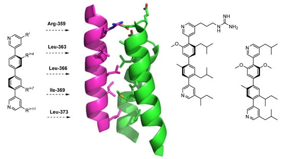 As a test case for our synthetic methodology (see Supplementary Materials), we choose the PPI between β-catenin and Bcl9, which is an important regulatory factor in the development of cancer via the Wnt signaling pathway [25]. The β-catenin/Bcl9 PPI has been well characterized, and the group of Verdine has developed stapled peptides addressing this PPI [26]. By analyzing available structural information from the β-catenin/Bcl9 interface [27], we identified Arg-359, Leu-363, Leu-366, Ile-369, and Leu-373 as relevant amino acids of an α-helix structural element. This led us to propose the following quateraryl structures as target molecules (Figure 1).