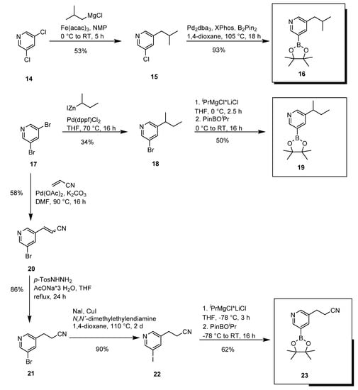 - Peters, M.; Trobe, M.; Breinbauer, R. A modular synthesis of teraryl-based α-helix mimetics, part 2: Synthesis of 5-pyridine boronic acid pinacol ester building blocks with amino acid side chains in 3-position. Chemistry 2013, 19, 2450–2456. [Google Scholar] [CrossRef] [PubMed]