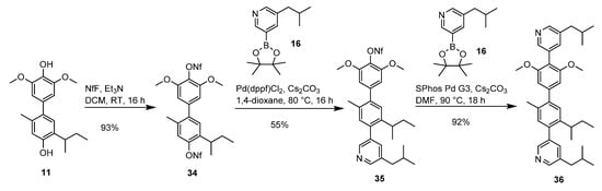 Similarly, the Leu-Ile-“MeO”-Leu-quateraryl 36 could be assembled in an impressive 47% overall yield from the bisphenol 11 (Scheme 5). For the coupling of the second nonaflate, again the SPhos Pd G3 catalyst [37] turned out to be very efficient.