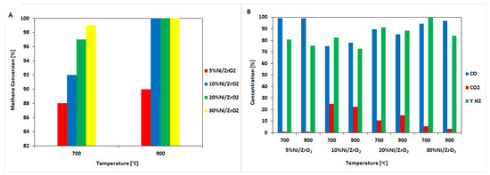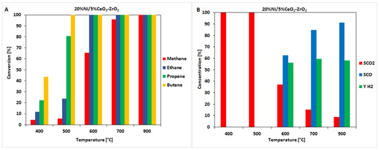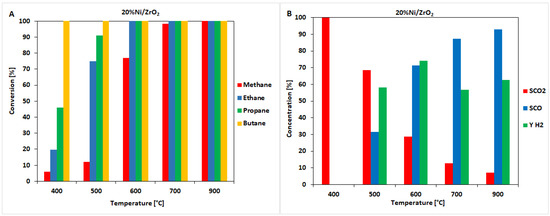 Results of the catalytic activity measurements performed in the temperature range 400–900 °C in the OSRM of a liquified natural gas (LNG) reaction on a 20%Ni/ZrO2 catalyst. (A) Hydrocarbon conversion. (B) The selectivity of CO and CO2 and hydrogen yield.