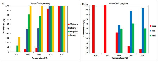 Results of the catalytic activity measurements performed in the temperature range 400–900 °C in the OSRM of the LNG reaction on a 20%Ni/5%La2O3-ZrO2 catalyst. (A) Hydrocarbon conversion. (B) The selectivity of CO and CO2 and hydrogen yield.