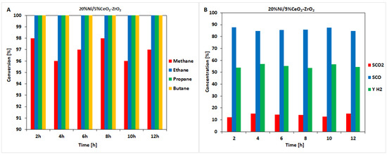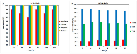 Results of the time-on-stream catalytic tests performed during 12 h of the OSRM of the LNG reaction on a 20%Ni/ZrO2 catalyst. (A) Hydrocarbon conversion. (B) The selectivity of CO and CO2 and hydrogen yield.
