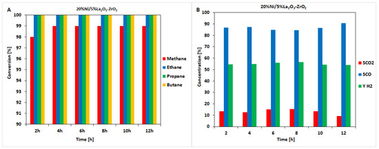 Next, the catalytic tests during the 12 h of the reaction for the 20%Ni/ZrO2, 20%Ni/5%La2O3-ZrO2 and 20%Ni/5%CeO2-ZrO2 were carried out in the oxy-steam LNG reforming process at 700 °C, and the results are given in Figure 6, Figure 7 and Figure 8, respectively. The results of the time-on-stream catalytic tests showed that all investigated catalysts were stable during the process. It should be emphasized that the Ni catalyst with La2O3 addition exhibited stable methane conversion equal to 99% and other light hydrocarbon conversions (ethane, propane, butane) after 4h of the running the process. Other tested catalysts showed slight changes in methane conversion values during the period of catalytic tests. In addition, all three catalysts showed very similar selectivity towards CO and CO2 and hydrogen yield.