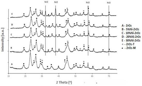 XRD curves of the ZrO2 and monometallic Ni/ZrO2 catalysts calcined in an air atmosphere for 4h at 400 °C.