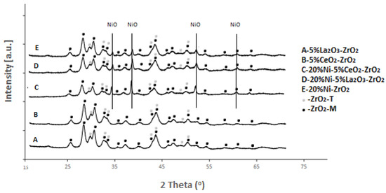 In order to correlate the reactivity of the Ni catalysts with the properties in the oxy-steam reforming of the LNG process, their physicochemical properties were investigated using various research techniques. The phase composition studies of the supports and Ni-calcined catalysts were studied using a conventional XRD technique, and the results are shown in Figure 9 and Figure 10. The phase composition studies of ZrO2 showed that this support consists of the tetragonal and monoclinic structure of the ZrO2 phase [17]. The XRD measurements performed for the calcined Ni systems confirmed the presence of the NiO, tetragonal, and monoclinic crystallographic structure of ZrO2 phases on the diffraction patterns [11] (see Figure 9). The addition of La2O3 or CeO2 oxide into the ZrO2 structure did not cause any changes in the phase composition of the investigated catalytic material (see Figure 10). The diffraction curves recorded for the 20%Ni/5%CeO2-ZrO2 and 20%Ni/5%La2O3-ZrO2 catalysts showed the presence of the same crystallographic phases that were detected for the Ni/ZrO2 catalyst. The only differences were observed for the 20%Ni/5%CeO2-ZrO2 catalyst. On the diffraction curve recorded for this system, the shift of the diffraction peaks assigned to the ZrO2 phases towards the lower 2 theta angle was observed compared to 20%Ni/ZrO2. These shifts of the diffraction peaks of zirconia may be explained by the presence of a solid solution between CeO2 and ZrO2 created during the preparation of the catalytic material.