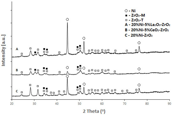 Furthermore, the phase composition studies of spent 20%Ni catalysts supported on ZrO2, 5%La2O3-ZrO2, and 5%CeO2-ZrO2 carriers were given in Figure 11. The results confirm the presence of monoclinic and tetragonal ZrO2 and metallic nickel phases on the diffractions curves. It is also worth emphasizing that the catalytic systems and the average size of the nickel oxide and metallic nickel crystallites were calculated based on the Scherrer’s formula which is presented below:
