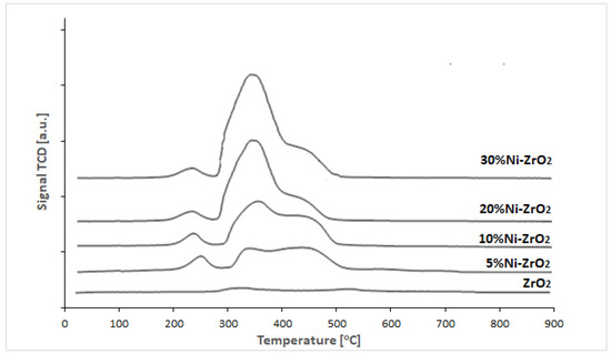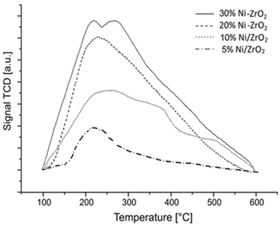 The reducibility of the Ni catalysts was studied using TPR-H2 method, and the results for ZrO2 oxide and Ni catalysts supported on this carrier are given in Figure 12.
