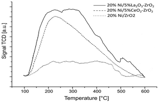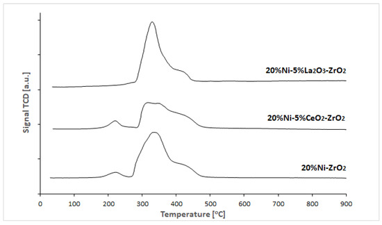 TPR-H2 profile recorded for the carrier itself shows two reduction stages located at about 310 and 520 °C assigned to the reversible hydrogen uptake of the ZrO2 surface [18,19]. Temperature programmed reduction studies performed for Ni catalysts confirmed a three-stage reduction process of the Ni systems. The TPR-H2 curve recorded for the 5%Ni/ZrO2 catalyst showed three reduction stages. The first effect located at about 230 °C is assigned to the reduction of free NiO species located on the support surface. The next two reduction effects located at 320 and 440 °C are assigned to the reduction of NiO interacted with support [6]. Similar reduction behavior was observed in the work [20,21]. The increase of the Ni loading in the catalytic systems shifts the reduction stages towards a lower temperature range and an increase in the intensities assigned to the low temperature effects. In the next step, we investigated the influence of CeO2 and La2O3 oxides addition on the reducibility of the 20%Ni catalysts. Figure 13 presents the reduction behavior of the 20%Ni catalysts supported on ZrO2, 5%La2O3-ZrO2, and 5%CeO2-ZrO2 carriers. The presented results clearly show that the addition of 5%La2O3 improves the NiO reduction that is manifested by the increase of the reduction peaks intensity compared to the reduction effects observed in the TPR-H2 profile of the Ni/ZrO2 catalyst. In addition, it should be also emphasized that the addition of La2O3 into the 20%Ni/ZrO2 system caused the increase in the intensity of the reduction stage, with the maximum of the hydrogen consumption peak located at 340 °C.