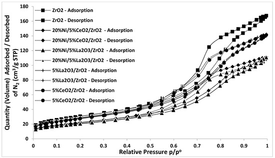 The specific surface area (SSA) measurements performed for ZrO2 and monometallic nickel catalysts are given in Figure 14 and Figure 15 and in Table 4. The obtained results show that the highest specific surface area had a ZrO2 support. The incorporation of the NiO phase on the catalyst support results in decrease in the SSA to 94.4 m2/g for the 5%Ni/ZrO2 catalyst. A further increase in the Ni content caused a similar effect. The BET results show that the 10%Ni/ZrO2, 20%Ni/ZrO2, and 30%Ni/ZrO2 catalyst exhibited the SSA values equal 85.0, 76.8, and 63.4 m2/g, respectively. The same effect was also observed for the ZrO2 system promoted by La2O3 and CeO2 oxides. In the case of the ZrO2 systems promoted by these oxides, a decrease of the specific surface area value was also detected, whereas the catalytic supports 5%CeO2-ZrO2 and 5%La2O3-ZrO2 were characterized by the SSA values equal to 98.5 and 92.7, respectively. The same tendency was observed for nickel catalysts supported on the 5%CeO2-ZrO2 and 5%La2O3-ZrO2 support material.
