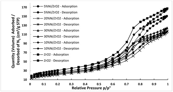 BET adsorption–desorption isotherms for monometallic Ni catalysts calcined in an air atmosphere at 400 °C for 4 h.