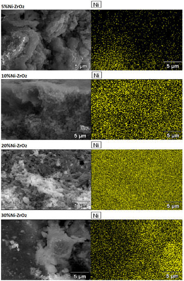 SEM-EDS measurements of monometallic nickel catalysts supported on ZrO2 monoxide carrier were done, and the results are given in Figure 19. The SEM measurements were done to study the surface morphology of the nickel-supported catalysts. The SEM images obtained for various monometallic Ni catalysts with Ni loading in the range 5–20% wt. are shown in Figure 19. The results obtained for the various Ni catalysts show that the Ni catalyst with 10 and 20% wt. of Ni exhibited homogenous distributions of nickel on the catalyst surface, which explains their high activity in the investigated processes. The SEM-EDS measurements performed on the investigated catalysts confirmed the composition of the investigated systems and the absence of impurities derived from the precursor salts used during the preparation of the catalysts.