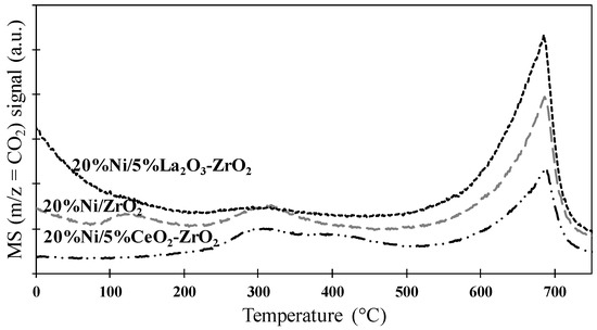 MS profiles for m/z = 44 (CO2) obtained during the thermal analysis performed in an air atmosphere of the spent (after twelve hours of the oxy-steam reforming of LNG process at 700 °C, molar ratio between reagents was used: C:H2O:O2 = 1:2.7:0.35, total gas flow 51 cm3/min) monometallic Ni catalysts supported on ZrO2, 5%CeO2-ZrO2, or 5%La2O3-ZrO2 oxides supports.