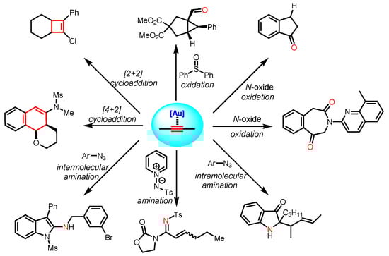 In past decades, homogeneous gold catalysis has been proved to be an extremely powerful approach in organic synthesis, owing to its high catalytic activities, benign reaction conditions and good tolerance of various functional groups, for the facile and practical construction of cyclic compounds, especially the heterocycles [41,42,43,44,45,46,47,48,49,50,51,52,53,54,55,56,57,58,59,60,61,62,63,64,65,66]. This strategy avoids the employment of hazardous and potentially explosive diazo compounds as starting materials for carbene generation. The generation of gold carbene, which is highly reactive and highly electrophilic, from readily available alkynes represents a significant advance in metal carbene chemistry. Substantial progress has been achieved in the synthesis and organometallic chemistry of Au–NHC complexes. The breadth of important structural skeletons, which can be constantly observed in bioactive molecules as well as in natural products, have been efficiently constructed through NHC gold-catalyzed oxidation/amination/cycloaddition of alkynes (Figure 2). It is surprising, however, that the review of catalytic oxidation/amination/cycloaddition of alkynes by the NHC gold complexes have seldom been reported, although significant advances have been achieved during recent years.