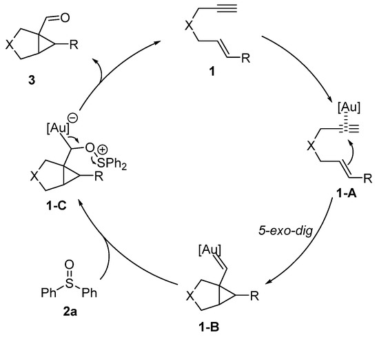 Toste et al. gave a plausible mechanism for the formation of cyclopropyl aldehydes 3 based on a series of control experiments (Scheme 3). Initially, coordination of the alkyne to the catalytic [AuI]-species facilely formed precursors 1-A, which then evolved to afford the gold cyclopropyl carbene complexes 1-B via a presumable 5-exo-dig cyclization. Subsequently, dimethylsulfoxide 2a nucleophilically attacked the gold carbenes 1-B to yield the cyclopropyl aldehydes 3 through intermediates 1-C concomitant with a S–O bond cleavage.