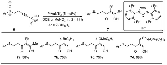 In 2007, Zhang and coworkers discovered a novel procedure for the NHC gold-catalyzed Intramolecular redox reaction of sulfinyl alkynes, leading to a series of β-hydroxyenones in 58%–75% isolated yields [70]. Notably, this protocol provided a two-step insertion of a latent vinylcarbonylmethylene group into carbonyl group and avoided using potentially explosive diazo compounds [71,72,73,74,75,76]. In the presence of 5 mol% of IPrAuNTf2, phenyl sulfoxides 6 could be facilely converted into a variety of β-hydroxyenones 7 (Scheme 4). Of particular note is that substituents with a different electronic nature on the aromatic rings were readily tolerated. This tandem reaction took place smoothly and the desired dicarbonyl products were exclusively obtained with selective phenyl migration.