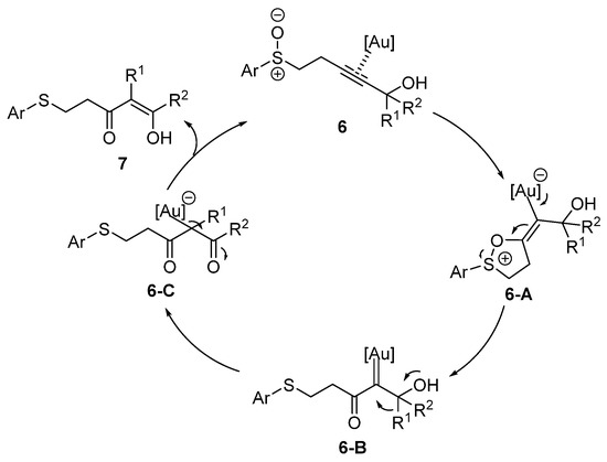 On the basis of the experimental observations, a plausible mechanism for this transformation was illustrated (Scheme 5). Firstly, intramolecular nucleophilic addition of S–O to the Au(I)-ligated triple bond generated successfully the α-oxo gold carbene intermediates 6-B through the vinyl gold intermediates 6-A. Subsequently, migration of R1 to the gold carbenes occurred smoothly to afford the final β-hydroxyenones 7 via the intermediate 6-C.