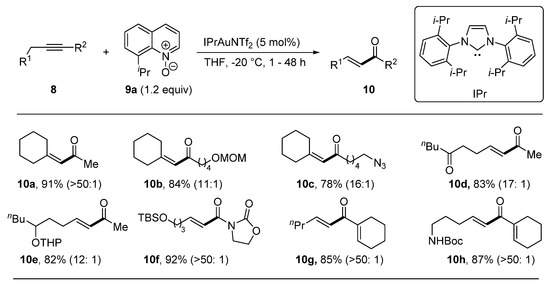Later, the same group developed a successful case of NHC gold-catalyzed intermolecular oxidations of internal alkynes by employing 8-isopropylquinoline N-oxide as oxidants, leading to the breadth of α, β-unsaturated carbonyls in good yields and with excellent E-selectivities [77]. This synthetic tool provided an efficient masking of α, β-unsaturated carbonyls as propargyl moieties, yielding a flexible and general solution to compatibility issues including α, β-unsaturated carbonyl compounds. In this study, α-oxo gold carbene generated from the alkyne oxidation proceeded smoothly 1,2-C–H insertions instead of further oxidation. As depicted in Scheme 6, the reaction of aliphatic alkynes 8 with 1.2 equivalent of 8-isopropylquinoline N-oxide 9a afforded smoothly the bulk of α, β-unsaturated carbonyl compounds 10 by employing IPrAuNTf2 as the catalyst in the absence of acid additives. A variety of readily available substituted aliphatic alkynes was further examined and the corresponding products were merely obtained in 78%–92% isolated yields with high regioselectivity. This approach exhibited good functional group compatibility and the alkynes with sensitive functional groups, such as OMOM (methoxymethyl), N3 and OTHP (2-tetrahydropyranyl), were well tolerated in all these cases.