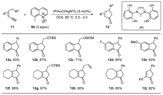 In 2012, Liu and coworkers reported a new synthetic approach for the construction of cyclopentenone derivatives involving a NHC gold-catalyzed intermolecular oxidation reaction of cis-substituted 3-en-1-ynes by employing quinoline N-oxide as oxidant [78]. A 1,5-hydrogen shift of formed gold-containing enol ether, rather than a carbene route, was probably the key step for this tandem reaction. As outlined in Scheme 7, enynes 11 with 3 equivalent of 8-methylquinoline N-oxide 9b could be readily transformed into a plethora of cyclopentenone derivatives 12 in 63–90% isolated yields with IPrAuCl/AgNTf2 (5 mol%) as the catalyst. Alkyl-substituted enynes were suitable substrates for this transformation to produce the desired products. Aromatic substrates bearing electron-withdrawing or electron-donating substituents on the phenyl ring also reacted well to smoothly yield the corresponding products in 63%–85% isolated yields. Furthermore, the alkyl-substituted substrates could also efficiently proceed to generate the desired products in 67%–90% isolated yields.