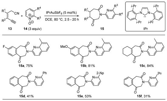 Following this work, the same group described a procedure of NHC gold-catalyzed oxoarylations of nitriles with pyridine-derived N-oxides by utilizing gold carbenes as initiators [83]. More importantly, this protocol was the first examples of the oxidations of nitriles with organic N-oxides to form oxoarylation products. In addition, it was found that a key intermediate seven-membered cyclic nitriliums could be involved. Nitriles 13 with 3 equivalent of pyridine-derived N-oxide 14 could be easily converted into the bulk of oxoarylation products in 31%–84% isolated yields by utilizing IPrAuSbF6 (5 mol%) as the catalyst (Scheme 9). The scope of the transformation was further explored with a series of substituted nitriles and the substrates bearing both electron-donation and electron-withdrawing on the aromatic were compatible with this relay transformation. The reaction proceeded smoothly with different 2-substituted pyridine N-oxides, yielding the desired oxoarylation products.