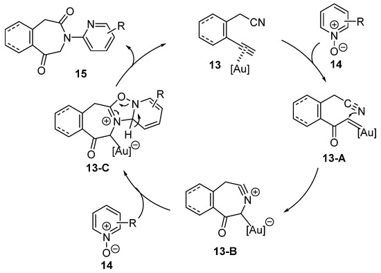 Liu et al. gave a plausible mechanism for the formation of oxoarylation compounds 15 based on a series of control experiments (Scheme 10). Firstly, nucleophilic attack of pyridine-derived N-oxides 14 on the [AuI]-ligated terminal C–C triple bond of nitriles 13 readily afforded terminal α-oxo gold carbenes 13-A, concomitant with a N-O bond cleavage, that induced an attack of the tethered nitrile to give the seven-membered nitrilium species 13-B. The species 13-B were further trapped by external N-oxide to deliver the azacyclic species 13-C, followed by a ring cleavage yielding the oxoarylation compounds 15.