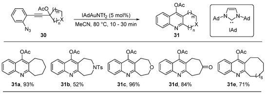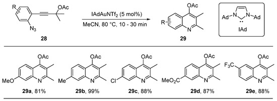 In 2013, Gagosz and coworkers disclosed a new method for the construction of polysubstituted quinolines through NHC gold-catalyzed intramolecular amination reaction of 2-alkynyl arylazides involving 1,3-acetoxy shift/cyclization/1,2-group shift sequence [87]. The mode of 2-alkynyl arylazides 28 in the presence of 5 mol% of IAdAuNTf2 facilely offered the breadth of polysubstituted quinolones 29 in 81%–99% isolated yields with various substrates (Scheme 16). This method worked efficiently for various 2-alkynyl arylazides containing both electron-donating and -withdrawing groups on the phenyl ring, and the resulting products were solely obtained. Notably, a variety of functional groups located at various positions of the aryl group were perfectly tolerated, including alkyl, halogen, ester, and CF3.