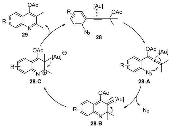 On the basis of the experimental observations, a plausible mechanism for this catalytic reaction was presented (Scheme 18). A 1,3-acetoxy shift [88,89] readily occurred, upon treatment with a NHC gold catalyst, to form allenes 28-A, which were attacked preferably by the nitrogen of azide, after extrusion of N2, to easily produce the gold carbenes 28-B. Subsequent 1,2-shift of methyl successfully took place and regeneration of the catalyst delivered smoothly the quinolones 29 via the cationic intermediates 28-C.