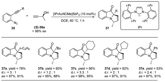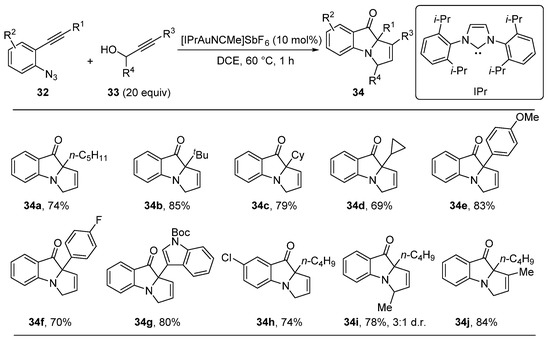 In 2015, Gong and coworkers provided a powerful and practical tool for the step-economical synthesis of pyrroloindolone derivatives from the 2-alkynyl arylazides and alkynols [90]. Note that optically pure alkynol substrates could be facilely converted into the chiral pyrroloindolone derivatives with two stereogenic centers, including a quaternary one, albeit with a slightly decreased enantiomeric excesses. It was found that the procedure of 2-alkynyl arylazides 32 with 20 equivalent of alkynols 33 afforded successfully a wealth of pyrroloindolone derivatives 34 with a wide range of structural diversity with [IPrAuNCMe]SbF6 (10 mol%) as the catalyst (Scheme 19). Besides an n-pentyl group, cycloalkyl, phenyl groups, and N-Boc protected indole were also readily tolerated, leading to the efficient formation of products. Moreover, this tandem reaction also worked well for 2-alkynyl arylazides bearing the substituents with a different electronic nature on the R1. A variety of alkynols were further screened and the expected products were exclusively obtained.