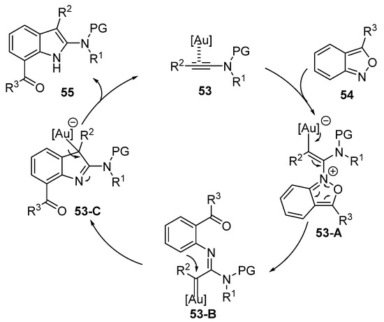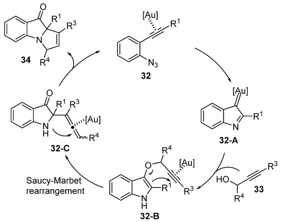 Gong et al. gave a plausible mechanism for the formation of pyrroloindolone derivatives 34 (Scheme 21). Firstly, intramolecular nucleophilic addition of the azide onto the NHC gold-activated species readily occurred, thus forming the α-imino gold carbenes 32-A, which were trapped quickly by an intermolecular O–H insertion to generate the 3-alkynyloxyindoles 32-B. Subsequent Saucy-Marbet rearrangement uniquely took place to deliver smoothly the allenes 32-C [91], followed by an intramolecular hydroamination reaction, catalyzed by the same NHC gold complex [92,93,94,95,96,97], to yield the final pyrroloindolone derivatives 34.