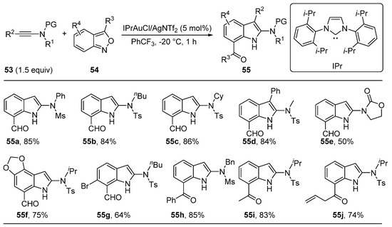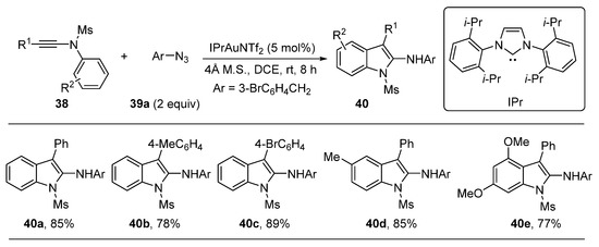 In 2015, Ye and coworkers reported a new procedure for the synthesis of 2-aminoindoles and 3-amino-β-carbolines involving the α-imino gold carbenes generated via NHC gold-catalyzed intermolecular amination reaction of activated alkynes and azide [98]. In the presence of 5 mol% of IPrAuNTf2, the type of activated alkynes 38 with 2 equivalent of azide 39a easily delivered the bulk of 2-aminoindoles 40 (Scheme 22). The substrates bearing both electron-donating and electron-withdrawing groups on the aromatic ring proceeded smoothly to afford the corresponding products in 77%–89% isolated yields.