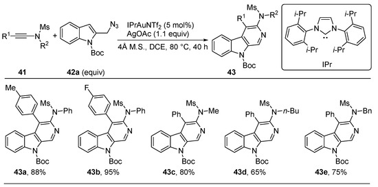 Besides 3-bromobenzyl azide, this catalytic reaction also underwent efficiently with indolyl azide 42a, leading to the 3-amino-β-carbolines 43 instead of the previous 2-aminoindoles (Scheme 23). This was presumably attributed to the stronger nucleophilic capability of indolyl part than the aryl group on nitrogen of activated alkynes.