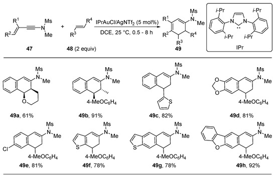 In 2012, Liu and coworkers discovered a protocol for the NHC gold-catalyzed [4+2] cycloaddition reaction of enynes with alkenes, leading to various 2-aminonaphthalenes [100]. However, the relevant gold-catalyzed intermolecular reactions of alkynes with alkenes had seldom been explored [101,102,103,104,105,106,107,108]. In this work, initial attack of external alkene on the [AuI]-ligated C–C triple bond of enyne formed cyclopropyl gold carbene, which was then trapped by the tethered phenyl group. In the presence of 5 mol% of IPrAuCl and 5 mol% of AgNTf2, enynes 47 with 2 equivalent of alkenes 48 could be transformed successfully into a plethora of cycloadducts 49 (Scheme 25). The functional groups such as 4-methoxyphenyl and 2-thienyl on the double bond were readily tolerated in this tandem reaction. A variety of substituents (e.g. benzo[d][1,3]dioxole, 4-chlorophenyl, 3-thienyl, and 3-benzofuryl) on the enynes also worked well in the reaction to smoothly yield the desired cycloadduct compounds.