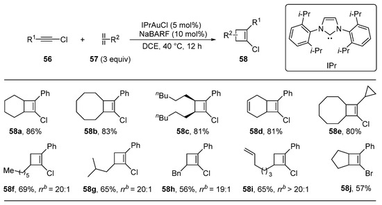 - Bai, Y.-B.; Luo, Z.; Wang, Y.; Gao, J.-M.; Zhang, L. Au-Catalyzed Intermolecular [2+2] Cycloadditions between Chloroalkynes and Unactivated Alkenes. J. Am. Chem. Soc. 2018, 140, 5860–5865. [Google Scholar] [CrossRef] [PubMed]