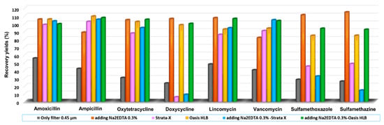 As shown in Figure 2, when the water samples were only filtered through 1-μm glass fiber and 0.45-µm nylon membrane filters, poor recovery yields (< 50%) were observed for most of the antibiotics. Furthermore, the baseline noise was very high (× 104) due to the presence of suspended solids. Meanwhile, the first extraction process with an addition of 0.3 g Na2EDTA was the best for significant improvement in recovery efficiencies (81.8–114.6%) as well as reducing dramatically the baseline noise to 2 × 102 for all the target compounds. These results met compliance requirements and were consistent with the experimental results in [,,,,,,,,,,], in which the extraction recoveries were enhanced when Na2EDTA was used as a chelating agent to form complexes with inorganic elements and to bind the residual metals in the sample matrix and glassware. For the second procedure, Strata-X cartridges offered high extraction yields for AMOX, AMPI, OTC, VCM, LCM (i.e., 87.5–102.5%). However, it gave poor extraction yields for DXC, SMZ, and SMX (5.7–25%) because of the strong retention of neutral- and medium-polar compounds of Strata-X as it is a reverse-phase functionalized polymeric sorbent. The use of HLB-SPE resulted in high recovery yields in the range of 84.6–109.2% owing to the balance between the hydrophilic N-vinyl pyrollidone and lipophilic divinyl benzene that provided a superior reversed-phase capacity and a retention enhancement for polar analytes. However, it required a longer sample treatment time (30 min/sample). For the third process, prior to use of Strata-X or HLB cartridges, an addition of 0.3% Na2EDTA reduced the matrix effects and slightly enhanced the recovery yields. Indeed, the third procedure offered high recovery yields for all the antibiotics (89.3–107.4%), whose results were comparable to previous works [,,,,,,,,,,,,,], but it required a long sample preparation time of 40 min/sample. Briefly, higher cost and longer sample preparation time were the main drawbacks of the second and the third procedures, compared to the first process, which had a short preparation time of 10 min/sample and was 60% cheaper (Figures S22–S25 in SM).