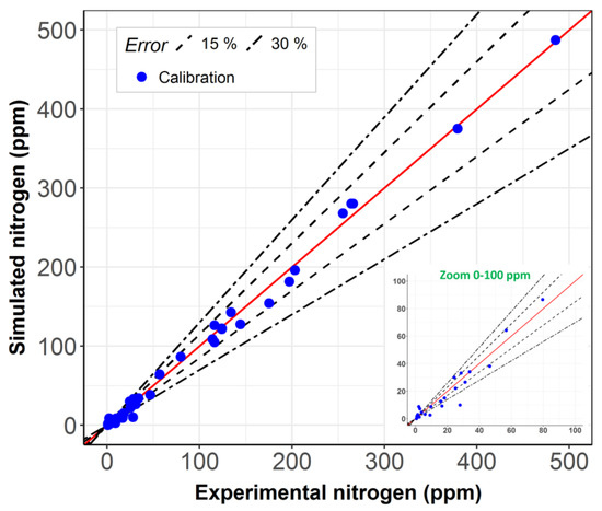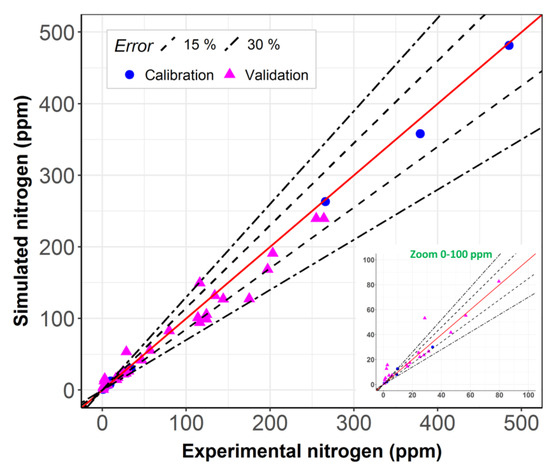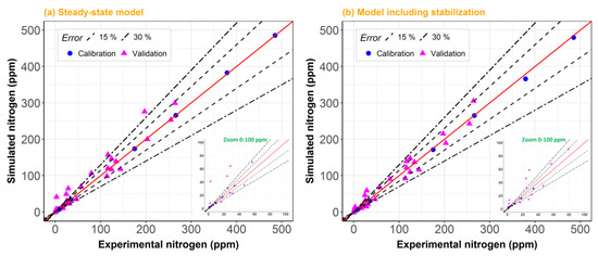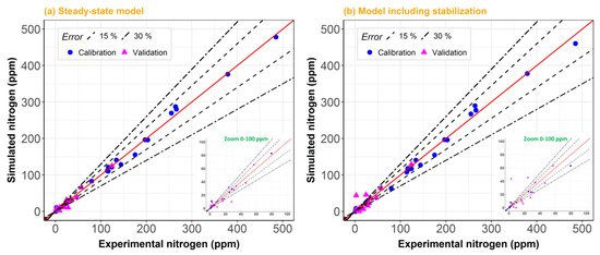 In the case of a calibration database containing 20 episodes selected by the D-optimal design, the accuracy of the model including stabilization was similar to the steady-state model. The parity plots are detailed in Figure 4.
