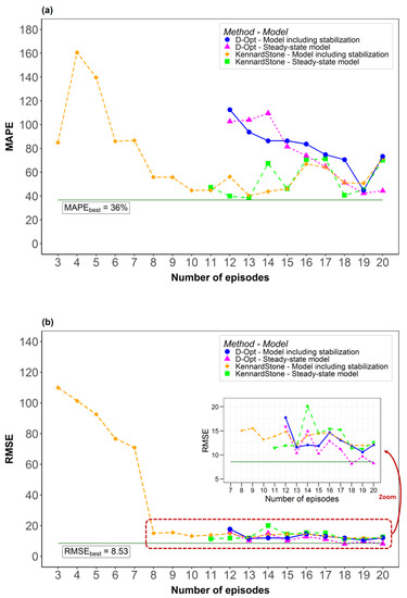 Indicator mean absolute percentage error (MAPE) (a) and root mean square error (RMSE) (b) on 38 steady-state points as a function of the number of episodes in the calibration dataset (the dark green horizontal solid line represents the indicator of the best scenario).
