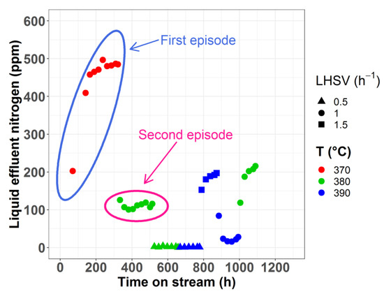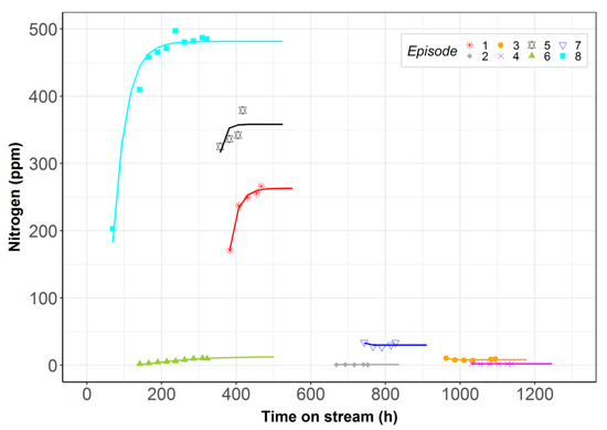 Experimental points were measured in terms of nitrogen content in the liquid effluent over time on stream. For one set of operating conditions, the series of consecutive experimental points obtained during transient regime until reaching the steady-state is denoted as an ‘episode’ [27]. In other words, consecutive experimental data points at the same operating conditions were recorded as one episode. Figure 10 shows an example of one experimental test comprising seven episodes totaling 42 data points acquired in about 45 days. The first episode corresponded to the start of the test at specific operating conditions, while later episodes were initiated by a change in operating conditions such as LHSV or temperature. Note that LHSV represents the ratio of liquid volumetric flowrate and the catalyst volume in the reactor, which is the inverse of the space time.